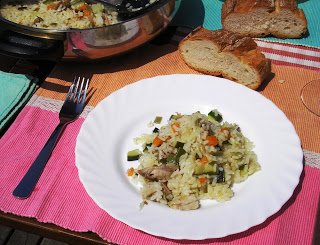 En nuestro caso, aprovechando una paleta de conejo que teníamos asada, la deshuesamos y partimos en trozos. Con los huesos y alguna verdura, hacemos un caldo. Dejamos hacer mientras vamos preparando el resto de ingredientes.