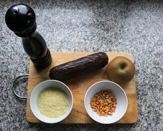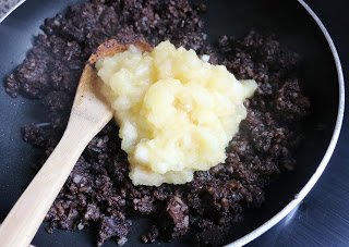 Desmenuzamos la morcilla en una sartén amplia a fuego lento. En otro recipiente colocamos la manzana pelada y troceada y la vamos removiendo a fuego lento hasta conseguir una textura de compota. Incorporamos la manzana (reservando una tercera parte) a la morcilla y añadimos pimienta recién molida. Ya fuera del fuego incorporamos los copos de patata y mezclamos bien. Dejamos enfriar.