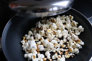 En otra sartén colocamos el maíz tapado y a fuego medio esperamos a que vaya estallando y convirtiéndose en palomitas. Agitamos la sartén de vez en cuando para que no se quemen. Trituramos las palomitas en una picadora sin que se pulverice totalmente, con trocitos pequeños.