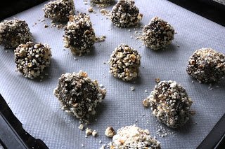 Moldeamos la mezcla de morcilla, manzana y copos de patata haciendo bolitas del tamaño de una nuez aproximadamente, con las manos o con dos cucharas, y las cubrimos de las palomitas trituradas, como si fuera un rebozado. Las colocamos en una bandeja o fuente y las horneamos a 200º durante 10 minutos aproximadamente, hasta que las palomitas se doren ligeramente.