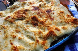 Hacemos una bechamel con la mantequilla, la harina y la leche, sazonándola con sal y nuez moscada. Cubrimos con ella los canelones. Espolvoreamos de queso rallado y llevamos a gratinar al horno hasta que la superficie se vea dorada.