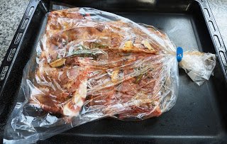 Ponemos a calentar el horno a 140º. Introducimos el costillar en una bolsa de asar, así como el adobo que pudiera quedar. Cerramos la bolsa. Si nos parece poco líquido podemos agregar medio vaso de agua o vino blanco.