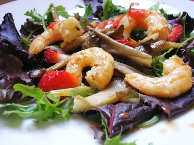 Picamos el ajo muy fino y lo ponemos a rehogar con cuidado de que no se queme, Añadimos los langostinos y salteamos. Retiramos. En la misma sartén rehogamos las setas cortadas en tiras. Reservamos. Cortamos parte de las fresas en láminas.