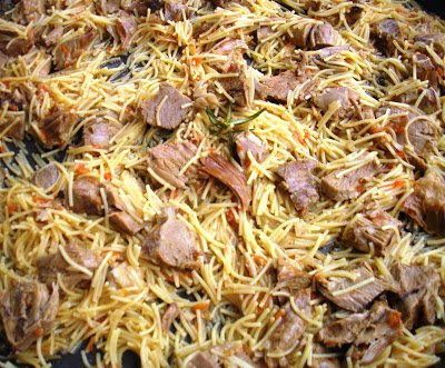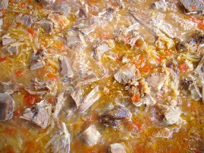 Asamos la pierna de cordero al horno manteniéndola separada del fondo de la bandeja, en la que iremos incorporando agua para que siempre haya humedad, hasta que la carne se separe del hueso (hora y media aproximadamente a 200 º). Podemos incorporar unas ramitas de romero. Una vez asada troceamos la carne y la reservamos, junto con los huesos y el jugo que haya soltado. En una cazuela tostamos los huesos y hacemos un caldo con verduras (cebolla, zanahoria y laurel), agua, sal y pimienta, al que añadiremos al final el jugo del asado.