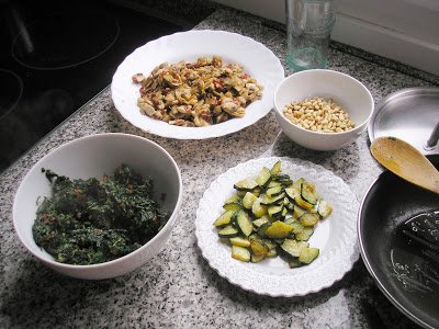 Salteamos las espinacas (en caso de utilizar congeladas, las hervimos unos minutos y escurrimos bien). Retiramos a un plato. Rehogamos el calabacín en un poco de aceite. Cuando esté casi hecho añadimos el resto de los tomates, los piñones y las espinacas. Tenemos unos instantes mezclando bien.