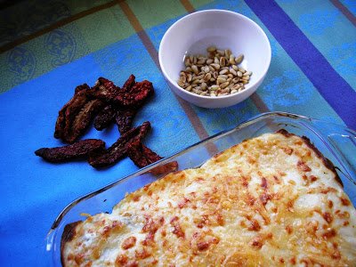 Ponemos a hidratar los tomates en agua o aceite. Hidratamos también las láminas de lasaña en caso de que sean precocidas, y si no lo son las cocemos siguiendo las instrucciones del fabricante. Tostamos los piñones en una sartén y reservamos.