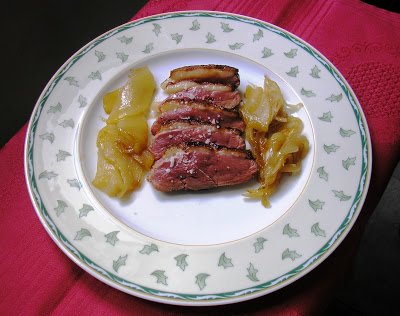 Hacemos unos cortes en forma de rombo en la piel del magret. Colocamos en una sartén o plancha muy caliente con la piel hacia abajo. Pasados 5 minutos, cuando la piel ya esté crujiente, retiramos parte de la grasa, damos la vuelta manteniendo a fuego medio otros 3 minutos. Desechamos la grasa. Fileteamos en porciones no muy finas y echamos sal gruesa. Lo servimos acompañado de la guarnición de manzana y cebolla.