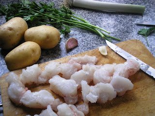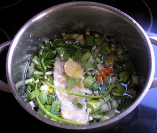 En primer lugar preparamos un caldo corto con las espinas y cabeza del pescado, la zanahoria, puerro y cebolla picados, el laurel, la pimienta, sal, un par de ramas de perejil y un chorro de aceite de oliva. Añadimos agua y dejamos cocer todo junto una media hora.
