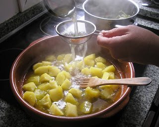 Cubrimos con aceite el fondo de una cazuela de barro o tartera y ponemos a freír los ajos que teníamos reservados. Damos un par de vueltas y añadimos las patatas, dejando rehogar unos minutos. Echamos el txakoli u otro vino blanco y dejamos evaporar el alcohol. Por último añadimos el caldo colado y dejamos que vayan cociendo las patatas a fuego medio. A media cocción, aproximadamente 15 minutos, añadimos el perejil y los guisantes.
