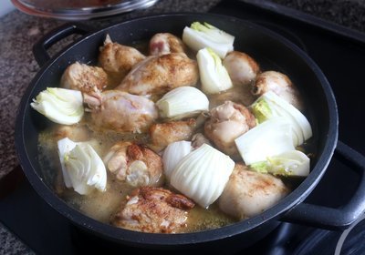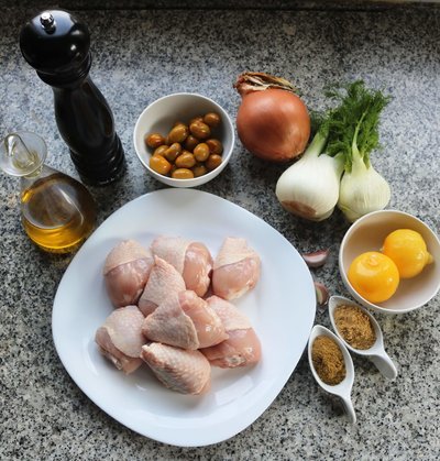En una cazuela baja echamos el aceite que nos ha sobrado de freír el pollo una vez colado y sofreímos la cebolla y el ajo hasta que se pongan transparentes. Añadimos el pollo, los limones y las aceitunas y el bulbo de hinojo cortado en cuartos. Salpimentamos con cuidado ya que las aceitunas aportan bastante sal. Cubrimos con agua o caldo y tapamos. Cuando empiece a hervir bajamos el fuego y dejamos hacer durante 1 hora y cuarto. Si vemos que queda bastante líquido destapamos para que se evapore.