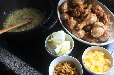 Freímos el pollo por tandas y vamos reservando. Mientras tanto picamos la cebolla y el ajo en trocitos pequeños. Deshuesamos las aceitunas y quitamos las pepitas a los limones y picamos ambos ingredientes.