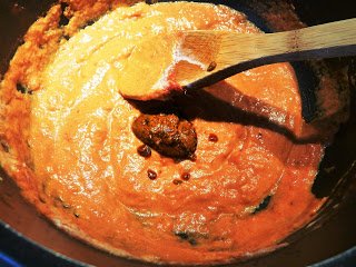 Para la salsa ponemos un par de cucharadas de aceite de girasol en una cazuela y sofreímos en él el ajo machacado, la cebolla picada y el jengibre. Cuando la cebolla comience a dorarse añadimos el tomate y tenemos unos diez minutos. Echamos sal, un poco de azúcar y el comino. Añadimos la nata o leche de coco y la pasta de tikka masala. Por último echamos el agua y dejamos hacer mientras cocinamos el pollo.