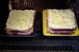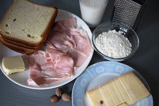 Tostamos ligeramente las cuatro rebanadas de pan. Untamos una primera rebanada con bechamel. Sobre esta capa colocamos el jamón cocido y una buena cantidad del queso que habremos rallado previamente. Disponemos encima la otra rebanada y la cubrimos también de bechamel y después el queso restante.