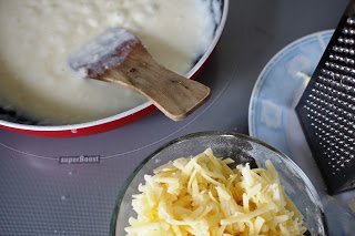 Empezamos preparando una bechamel con la harina, la mantequilla y la leche, que aromatizaremos con un poco de nuez moscada. Dejamos templar.
