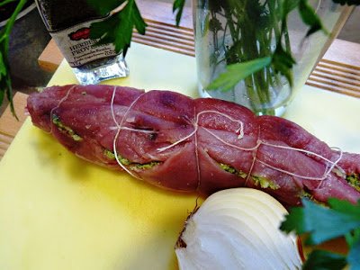 Sacamos el solomillo, quitamos el cordel y cortamos en lonchas. Servir con la salsa.