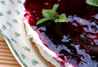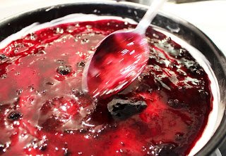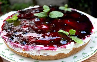 Cuando ya esté cuajada, ponemos en un cazo la mermelada de arándanos con una cucharada de agua y tenemos un poco a fuego medio hasta que se vuelva más líquida. Dejamos enfriar un poco y echamos sobre la tarta. Metemos de nuevo al frigorífico hasta el momento de servir.