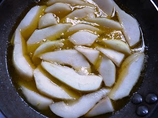 Pelamos y cortamos las peras en rodajas gruesas. Las disponemos con cuidado sobre la mezcla anterior cubriendo bien todo el fondo y dejamos que se vaya caramelizando.