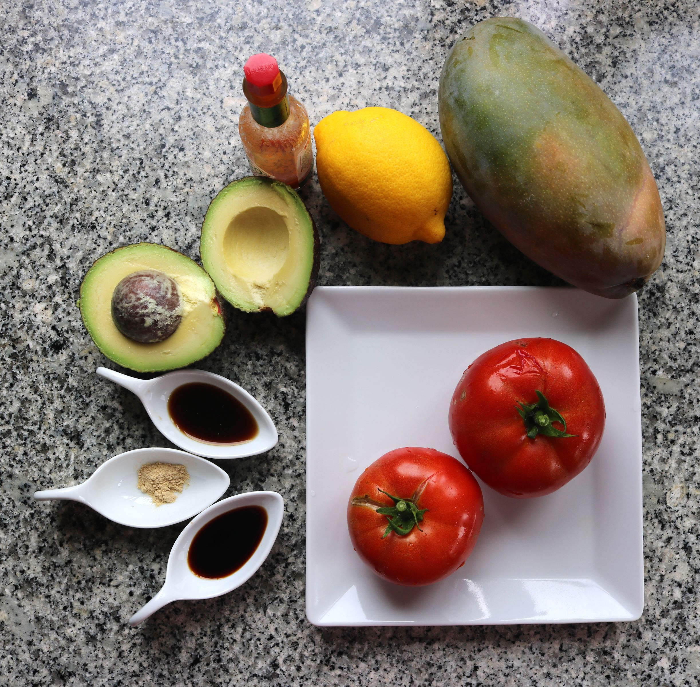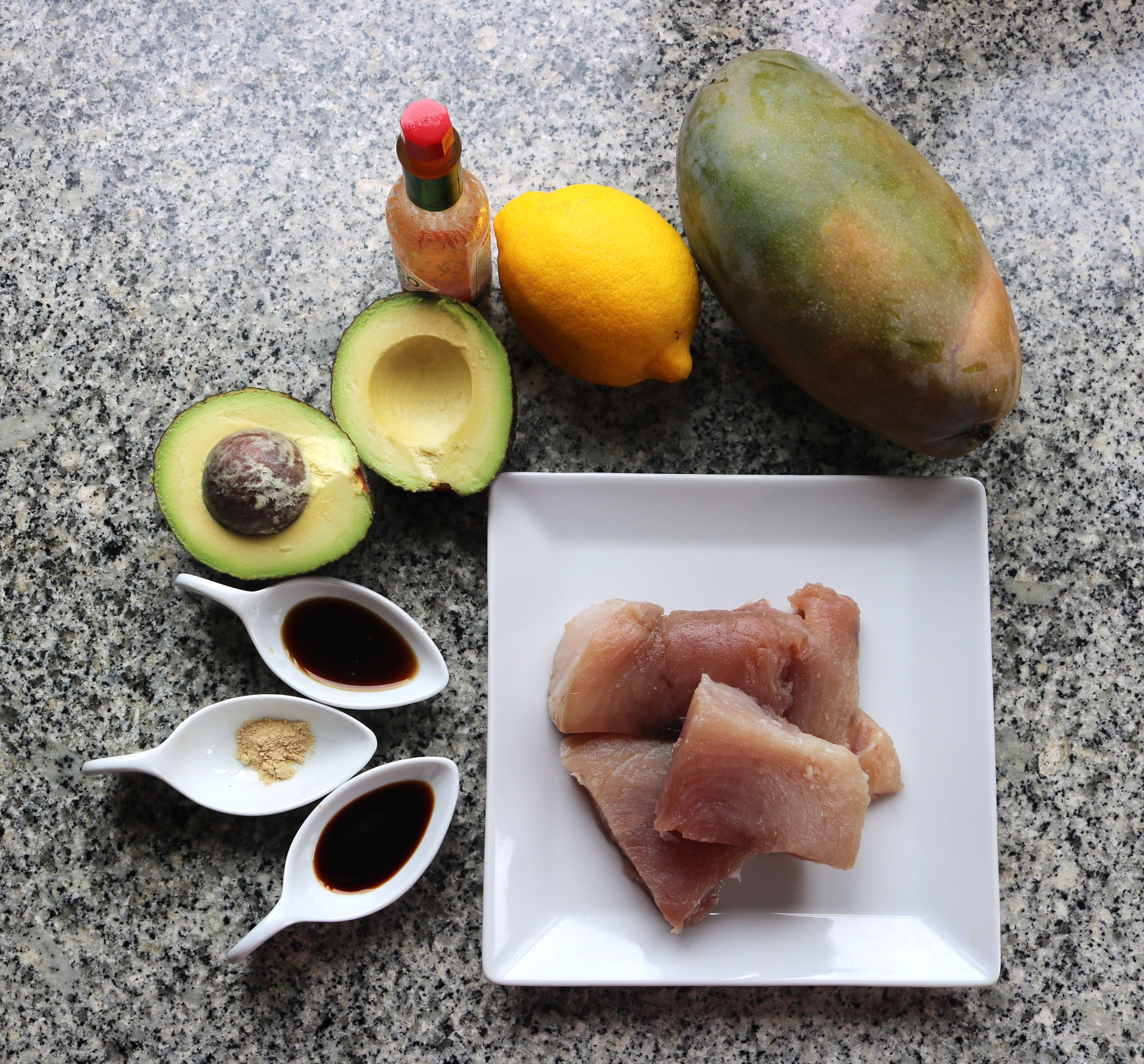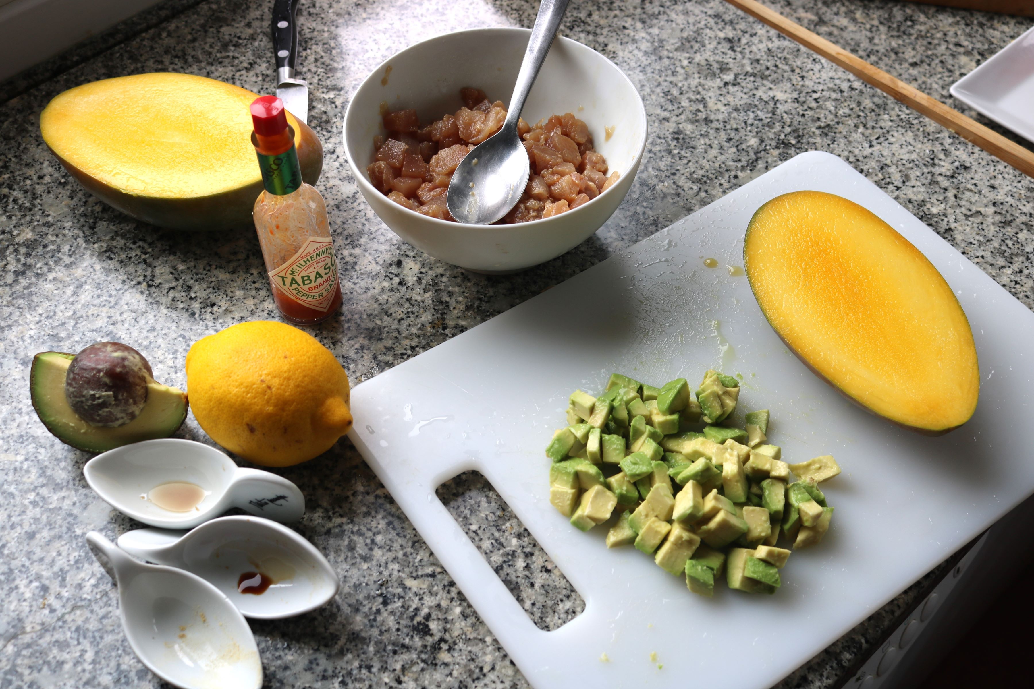 Picamos el aguacate y el mango en trozos similares al bonito. Echamos el resto del zumo de lima sobre el aguacate.