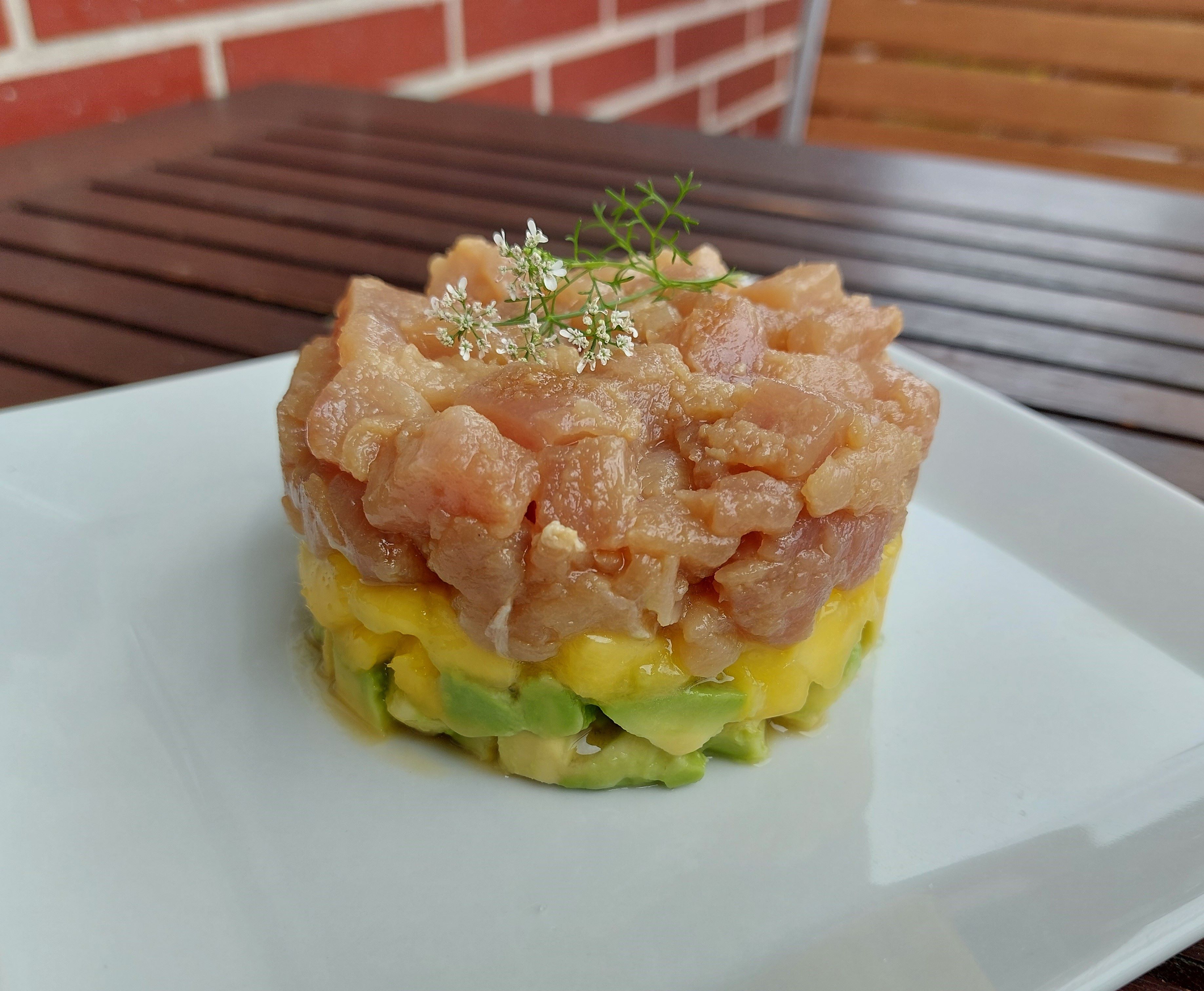 Con la ayuda de un aro de emplatar vamos disponiendo las capas en el siguiente orden: aguacate en la base, después el mango y por último el bonito o el tomate. Retiramos el aro con cuidado y adornamos con alguna hierba.